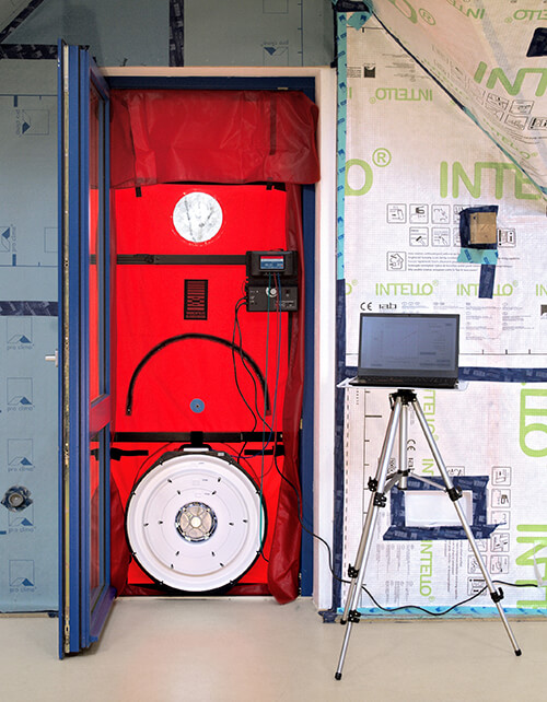 Blower Door test ověří, zda budova nepropouští vzduch tam, kde nemá. Měření pomocí ventilátoru ve vstupních dveřích vytvoří řízený podtlak / přetlak. Podle toho přesně určíme místa úniku a stanovíme hodnotu n50, která určuje vzduchotěsnost stavby.